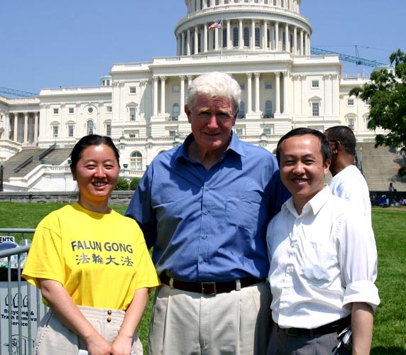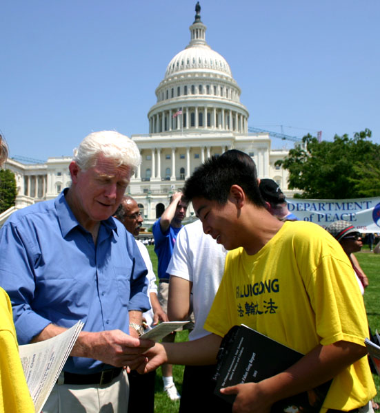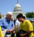 今天在国会大厦前的另一片草地上同时举行了百万母亲游行的集会活动,有很多国会议员到场讲话。法轮功学员们也在现场巧遇了几位马里兰州和弗吉尼亚州的国会议员。