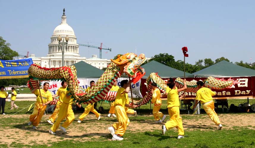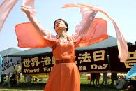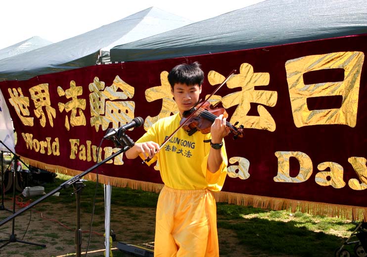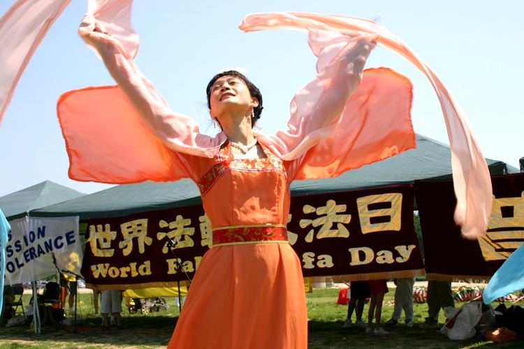 法轮功学员们用中英文合唱“为你而来”,舞龙,仙女舞,和五套功法展示。几位少年弟子表演笛子独奏、琵琶独奏、小提琴独奏。明慧学校的小朋友们合唱“浊世清流”、“得度”歌曲。