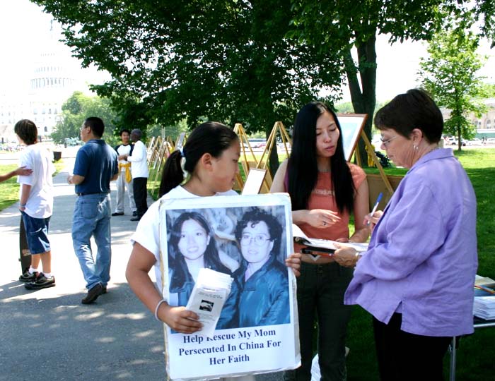 范女士不是法轮功学员,她57岁的妈妈却因为修炼法轮功连续三次被捕,现在仍被关押在河南省郑州市公安局第一看守所,生死不明,已经有五个多月了。在“母亲节”的这一天,范女士驱车一个多小时来参加法轮功学员的庆祝活动,并带着营救她母亲的展板向路人征集签名。她再次向社会呼吁,帮助她母亲早出牢狱。许多路人都表示非常同情,并签名以示支持。关于范女士母亲的详情见明慧网报导:“旅美华人呼声:请帮助营救我正在河南监牢中受难的母亲”(https://www.minghui.ca/mh/articles/2004/3/13/69790.html)。