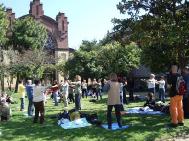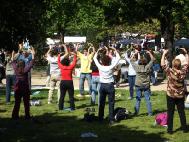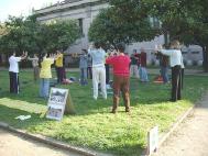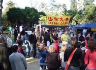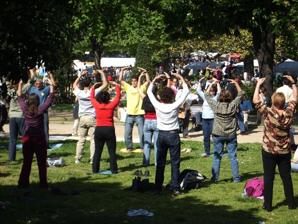 “地球日”活动的主办者们特意为学员们提供了一片教功场地,每一场教功都有很多人参加,可想而知人们是多么希望得法修炼。一个女孩是在第五套打坐功法时加入学功的队伍的,后来,她对学员们说,她是无意中才发现法轮功的,然而她却强烈的感到这是她很早以前就一直在寻找的修炼……