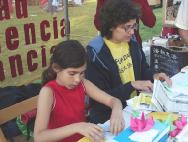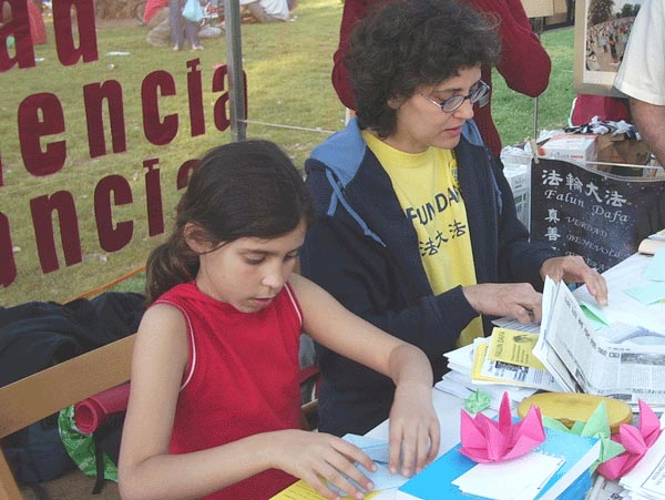 在与法轮功学员们交谈的人中,有不少人之前已经见过学员们在公园里炼功从而对法轮大法有所了解,还有许多人是第一次听到大法,他们都很感兴趣来尝试练习法轮功并询问了炼功地点和时间。还有许多家长们带着孩子和学员们一起学习折彩色的纸莲花。当一个小孩子路过我们的展位时,他看到了学员打坐的照片,他指着照片对父母说“我想学这个。”在看到他的父母拿齐了多种大法资料后,这个小孩才满意的离去。
