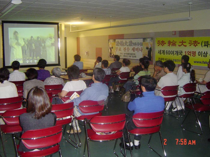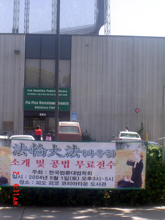 【明慧网2004年5月11日】加州洛杉矶市的韩国城 (Korean Town)以人数众多的韩国移民闻名,为了和韩国城的民众分享法轮大法的美好,洛杉矶法轮大法学员于2004年4月正式成立了韩国城的法轮大法炼功点,并于2004年5月1日,在皮欧皮克韩国城公共图书馆 (Pio Pico Koreatown Branch Library of Los Angeles Public Library)举办了洛杉矶市的第一个韩文法轮大法介绍班。