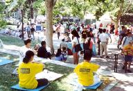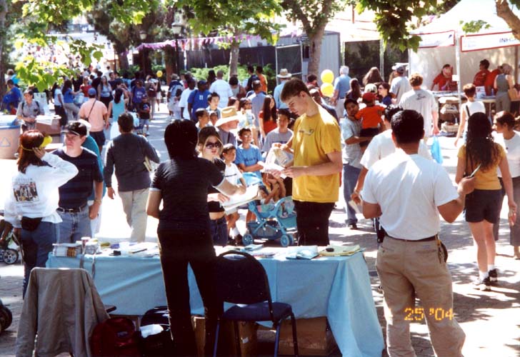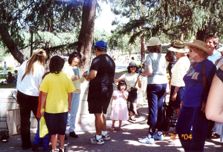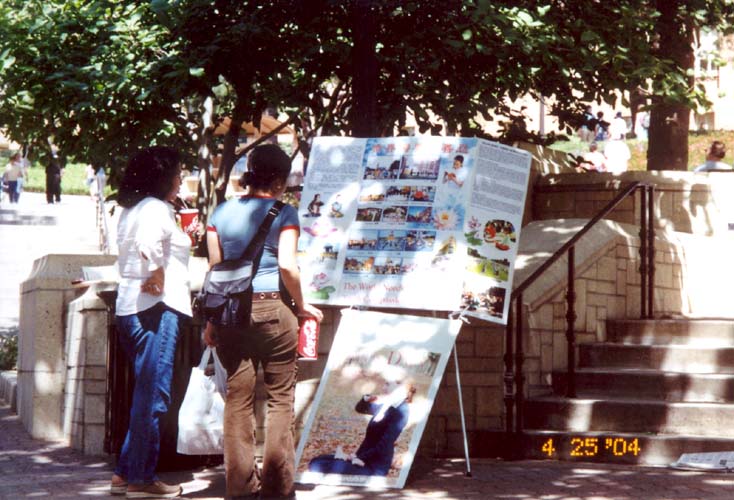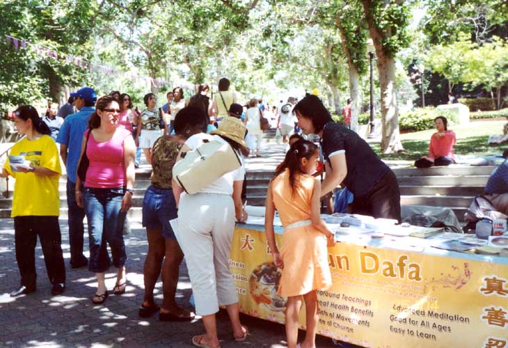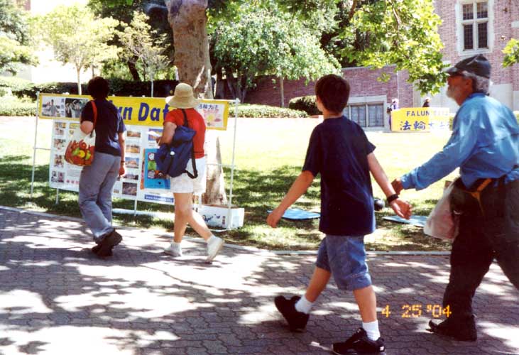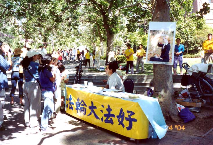 自2000年起,洛杉矶法轮大法学员每年均在图书节上免费教功,向人们介绍法轮大法的美好。今年的图书节在4月24日与4月25日举行,“法轮大法好”和“世界需要真善忍”等美丽的横幅早早就展示在校园里,向涌入书展的人潮问候。时值“4.25”和平上访五周年,学员们除了展示优美的法轮大法功法之外,也向人们讲真象,帮助人们了解“4.25”和平上访的真实情况,以及法轮大法学员在中国遭受残酷迫害的事实,同时呼吁善良的人们帮助营救因勇敢揭露迫害真象而被非法拘禁的美国公民李祥春医生。在今年的洪法活动中,擅长二胡的学员同时也在校园里演奏法轮大法音乐“普度”和大法弟子的音乐创作,悠扬的乐声让人仿佛走入世外桃源,心情恬静祥和,将户外的喧嚣置之度外。许多民众的心被深深打动了,不由得停下脚步,沉浸在“真善忍”的美好之中……