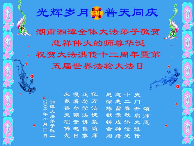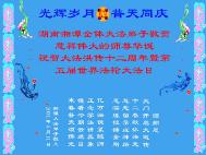 黑龙江省汤原县全体大法弟子庆祝第五届世界法轮大法日并恭贺师尊传法十二周年,在伟大的师尊圣诞日即将来临之际深深的祝愿师父生日快乐!