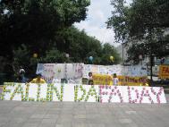 阿拉莫广场是圣城最热闹的地方,闻名的古迹阿拉莫(ALAMO)吸引大量游客。大法弟子们在广场的一侧架起真相展板和横幅,并用纸叠莲花拼成“5.13 法轮大法日”的英文字样,充满节日的氛围。
