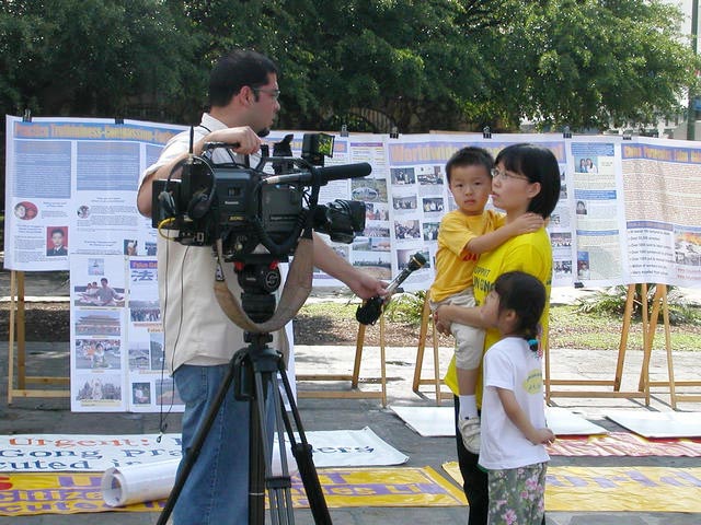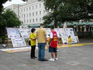 【明慧网2004年5月12日】5月9日,德州奥斯汀大法弟子和圣安东尼奥大法弟子一起,在圣城著名的阿拉莫广场(ALAMO PLAZA)举办图片展及讲真象活动,庆祝第五届“世界法轮大法日”暨师尊传法12周年。