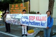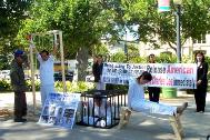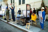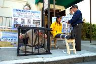 ![]() 学员在中领馆前演示在中国发生的迫害 | ![]() 旧金山KTSF电视台进行采访 | ![]() 在加州首府展示中国警察迫害法轮功学员的酷刑 |