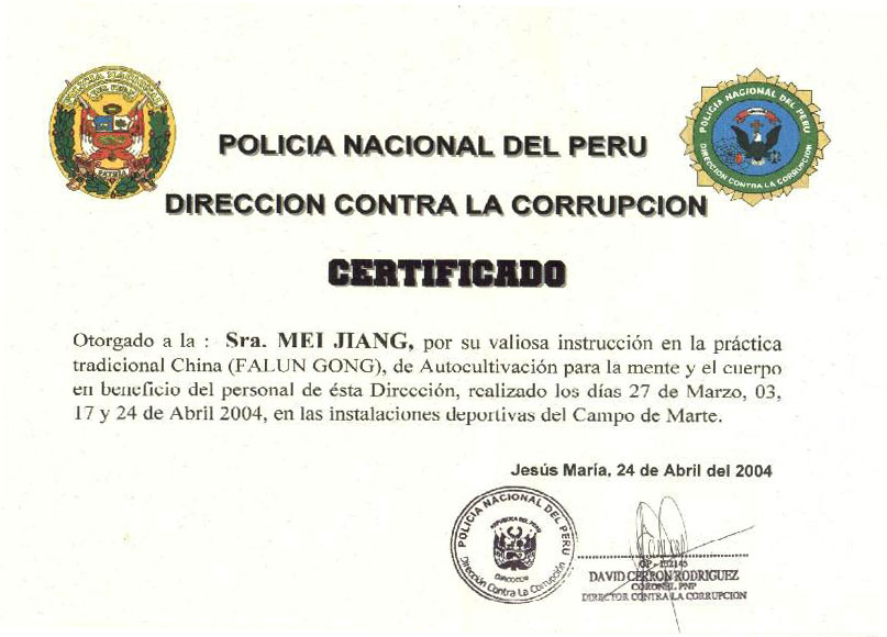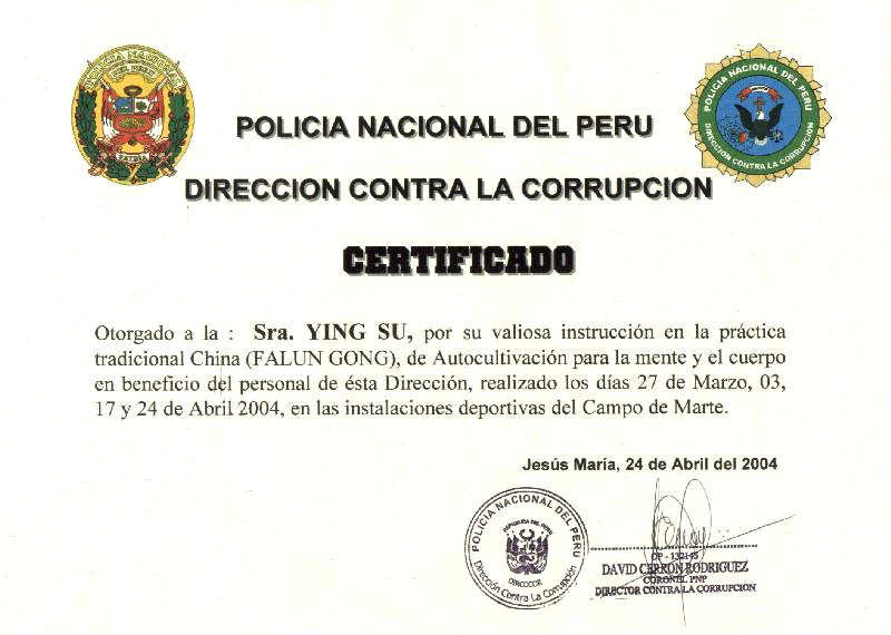 2004年3月27日至4月24日,秘鲁国家警察反腐败机构--廉正公署总部组织了100名警官于每个周六在利马耶稣玛利亚市区体育场学炼法轮功,期间,警官们進一步了解了法轮大法和集体观看了法轮大法真象图片。4月24日,法轮功学员江梅女士和苏英女士被分别授予由秘鲁国家警察反腐败机构(廉政公署)最高长官亲笔签署的表彰证书。表彰她们免费义务教授使人们身心健康受益的中国古老的有价值的法轮功功法的奉献精神。主持颁奖仪式的警官说:“这种奉献精神是值得人们赞扬和尊敬的。”