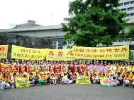 中国时报5月10日报道,来自全台湾各地约四千名法轮功弟子,九日齐聚在高市文化中心欢庆法轮大法十二周年纪念以及欢度母亲节。高雄市副市长林永坚以地主身分欢迎他们来到友善的海洋城市高雄,并赞扬他们抖擞的精神,显示大家都从“真善忍”中受福益。活动场面热闹,有四场次功法表演及精彩的腰鼓队展演外,莲花舞、彩带舞、法轮功旗阵、扇子舞、采茶舞、舞狮阵、气球阵、风车阵、剑阵、天使队数千人,沿著文化中心进行游行,宣扬法轮功真善忍。