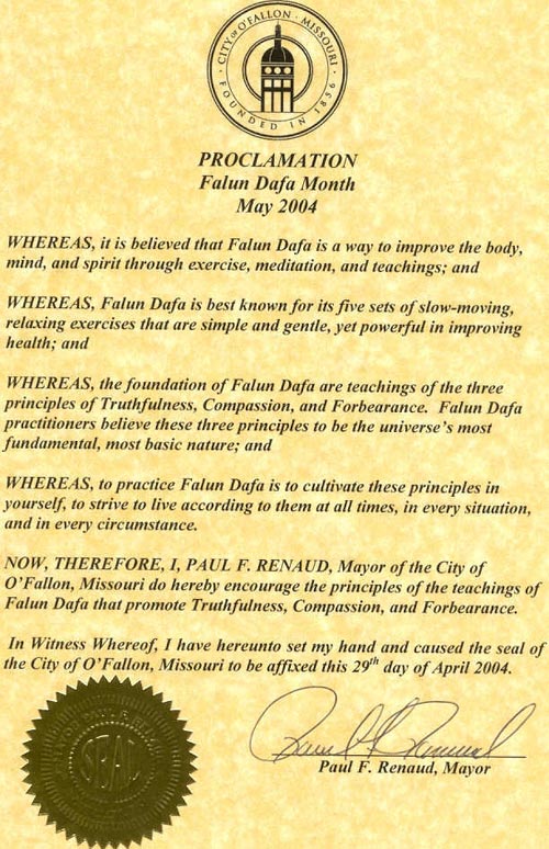 因此,我,密苏里州奥法隆市市长保罗-瑞那德特此鼓励提倡“真、善、忍”的法轮大法的法理。