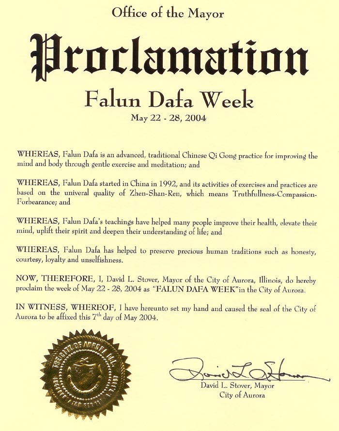 因此,现在,我,伊利诺伊州奥若拉市(Aurora)市长戴维-斯托弗(David L. Stover),特此宣布2004年5月22日至5月28日为奥若拉市法轮大法周。