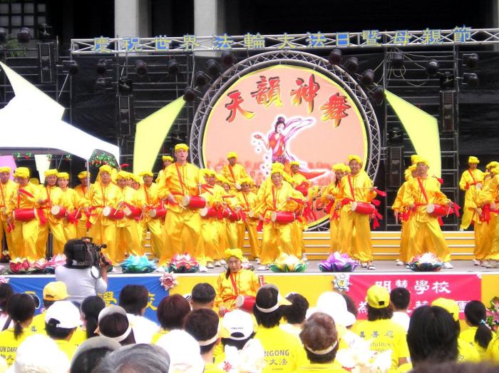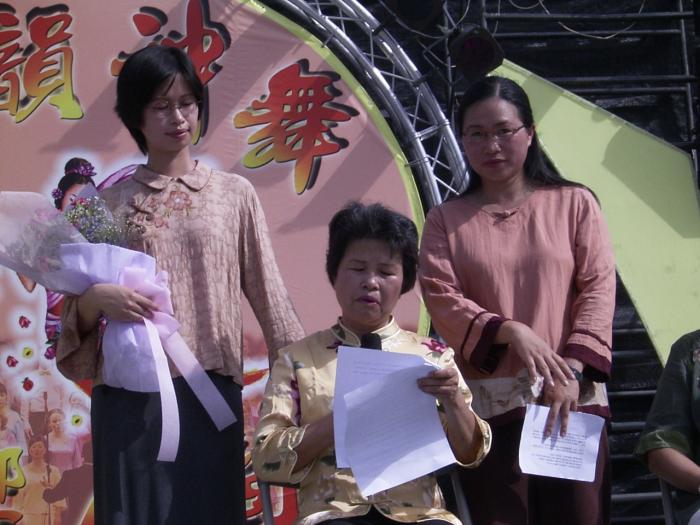 有四对母女在台上分享了修炼心得,来自高雄的彭姓母女,全家修炼,讲述六年前她先生学炼法轮功时、开始两年她和母亲持反对意见,因为当时她们各自有宗教信仰,但看到先生修炼法轮大法后整个人转变很大,全家因此陆续走上了法轮功修炼之路。