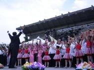 ![]() 四对母女在台上分享了修炼心得 | ![]() 全场所有表演者合唱一曲《法轮大法好》 |