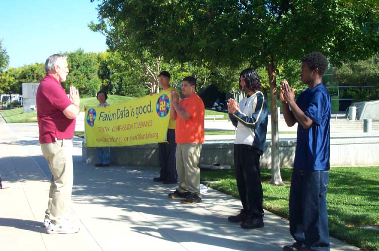 当“汽车之旅”到达圣塔-巴巴拉市时已将近傍晚5点。在市政府前的广场,有很多游人。他们看到学员在炼功,也跟着学。炼完功后,他们表示感觉很轻松,非常舒服。当他们了解到在中国,人们因为炼功而受到酷刑折磨,还被迫害致死,表示非常不解。