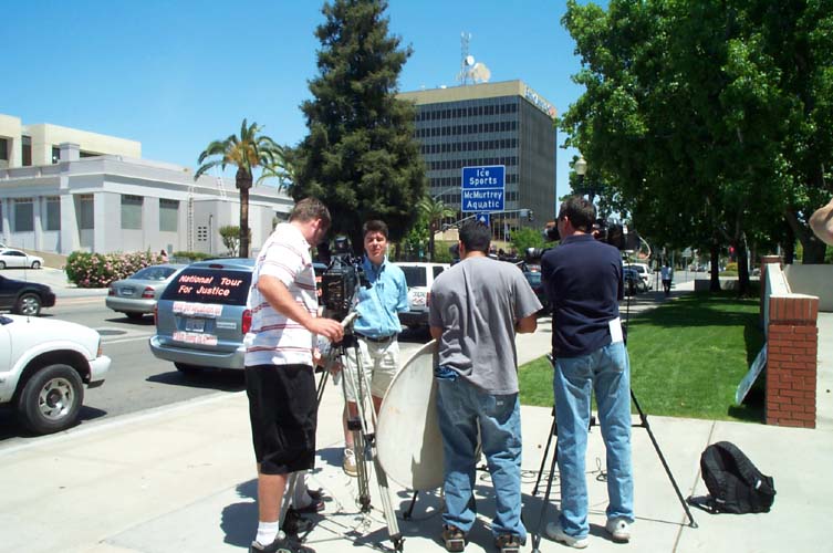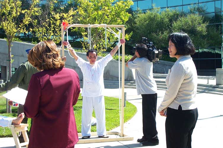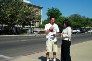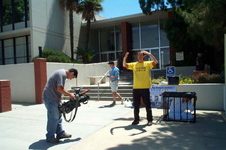 ![]() 人们在弗雷斯诺市市府前学功 | ![]() 弗雷斯诺媒体在酷刑演示现场进行采访 | ![]() 在弗雷斯诺市向路人讲真象 |