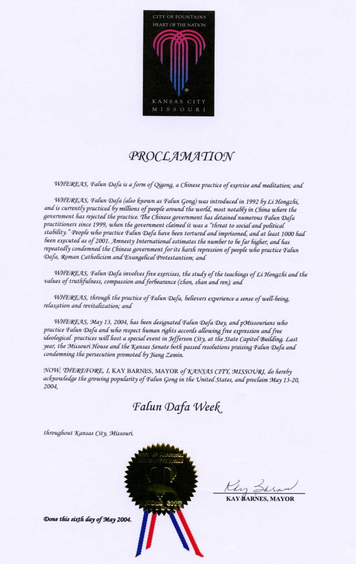 鉴此,我,密苏里州堪萨斯市市长凯-芭恩斯(Kay Barnes),特此承认法轮大法在美国境内获得了越来越多人的喜爱,并宣布2004年5月13-20日为堪萨斯市的