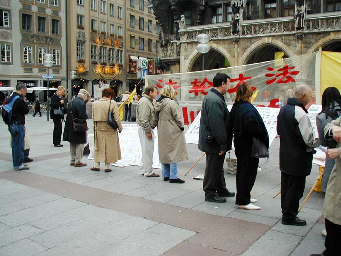 弟子们打出“法轮大法好”、“世界需要真善忍”等横幅,摆出“法轮大法洪传世界”、“正法之路”的展板,一遍遍的演练五套功法,将法轮大法的美好展现给德国民众和来自世界各地的游客。许多人观看了功法表演,并仔细的看了展板,有的人甚至还兴致勃勃的跟着学习功法,也有的人马上就到附近的书店订购一书。有不少人请大法弟子帮他们书写中文的“真善忍”和他们的名字,有的还替亲朋好友索要。当他们得知“真善忍”在中国被禁止了5年了,修真善忍的大法弟子被残酷:被洗脑、致死、关押在精神病院、被迫四处流浪、家破人亡和妻离子散时,他们简直不敢相信这是真的,许多人马上就在“法办江XX”征签表上签名。