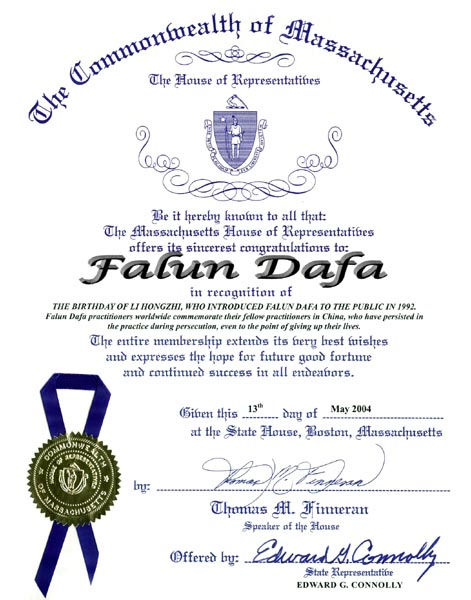 马萨诸塞州众议院向法轮大法致以最衷心的祝贺 !
