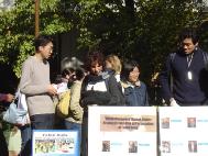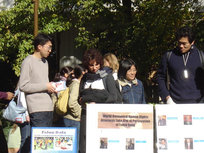 众多学生认真观看摆放于草坪前方的展板。一对西人学生主动跟学员说,他们早听说过法轮大法,一直不明白为什么这样一种于国于民皆有利的美好信仰却遭中国政府的镇压。学员耐心解释后,告诉他们所有的真相材料都是学员们一点一点凑起钱来自费印刷的,希望他们能够珍惜。他们听了深受感动,表示将会把自己手中的资料传给更多的人。