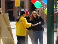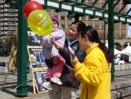 ![]() 向行人讲真象 | ![]() 路人聚精会神看展板 | ![]() 发放印有法轮大法好字样的气球,也给孩子们带来了一份祝福 |