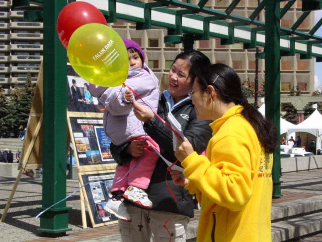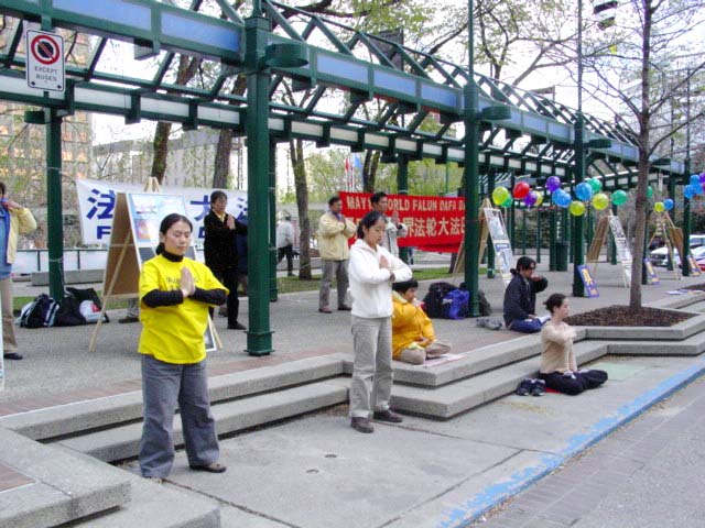 卡尔加里的奥林匹克广场,位于市政府的对面,是卡城的交通枢纽,附近有许多办公大楼,人口的流动量较大。今天,又是卡城冰球火焰队有一场决赛,所以,在体育场举行的球迷和歌星的庆祝活动,使得广场显得格外热闹。而法轮功学员的功法表演、正法之路系列图片展、以及醒目的横幅和彩色气球,吸引着更多来来往往的有缘人。