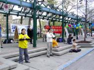![]() 学员们集体炼功 | ![]() 广场的总经理欢迎法轮功学员 | ![]() 向行人讲真象 |