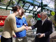 在活动期间,有两位大法学员到球迷中间去寻找市长,市长友好的见了学员并進行了简要的交流。虽然没有机会谈到更多法轮功的真象,但学员们相信,有了第一次的接触,以后会有更多的机会和市长面对面的交流。见过市长,学员又来到一群中国人中间,主动跟他们打招呼,询问他们是否来自中国,他们很高兴。但是,当知道是法轮功学员时,其中一名显得比较抵触,不想听还想把同伴拉走。但他的同伴都不为所动,依然饶有兴趣的听完真象,并问了不少问题。