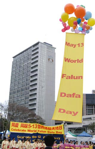巨幅法轮大法日横幅飘扬在奥克兰市中心