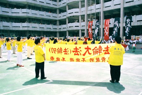 2004年5月8日是台北县三峡镇安溪国小学校暨社区联合运动大会,当天风和日丽、艳阳高照,与会的嘉宾络绎不绝。法轮功学员的功法表演登场,一出场就气势不凡,整齐浩大的队伍、庄严祥和的神态,加上优美的炼功音乐,全体学员随着音乐口令,缓、慢、圆的展示出五套功法的动作,吸引了在场许多嘉宾的注目和赞叹。
