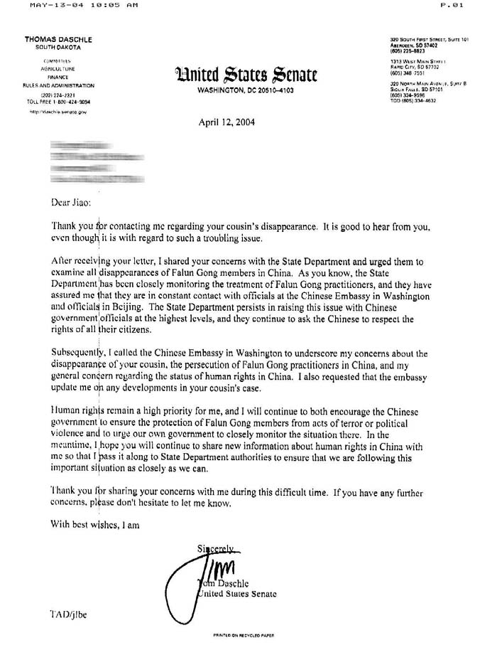 达沙迩参议员在信中说,一接到你的来信,我就向国务院转达了你的关注,并敦促国务院对所有中国法轮功学员失踪一事展开调查。国务院一直以来都在密切关注法轮功学员[在中国大陆]的遭遇,并坚持向中国最高层政府官员提出该问题,他们会继续要求中国尊重其本国公民的权利。