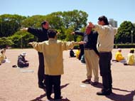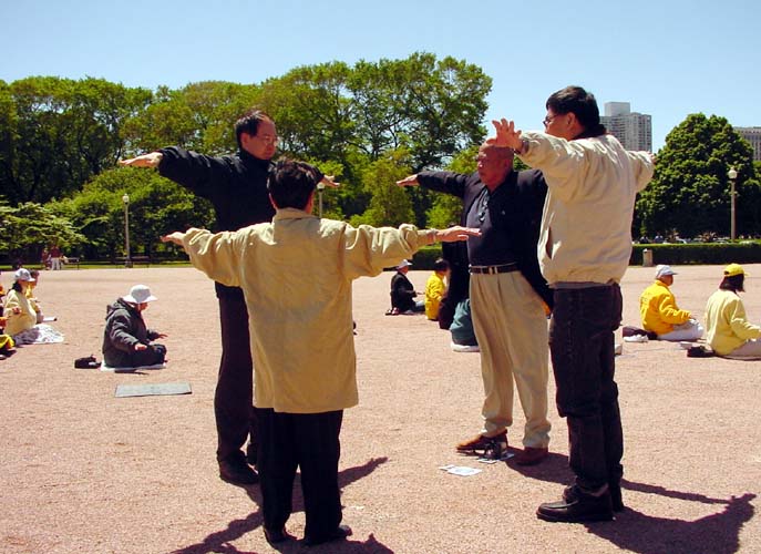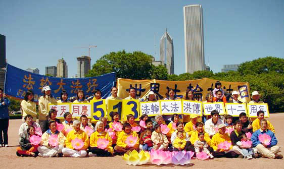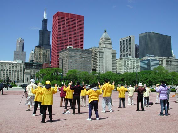 ![]() 面对密歇根大道集体炼功 | ![]() 感兴趣的游人认真学炼动作 | ![]() 部分大芝加哥地区学员们合影,齐颂“师父您好,师父生日快乐” |