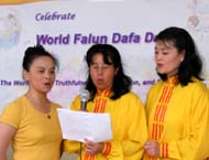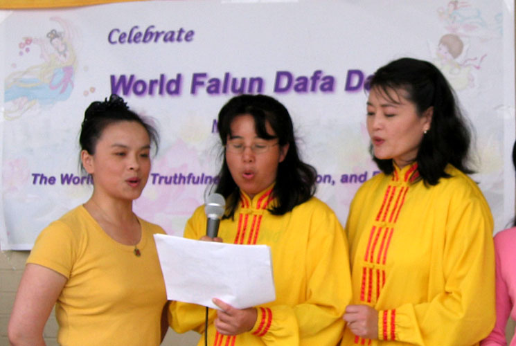 ![]() 庆祝世界法轮大法日 | ![]() 女生合唱“得度” | ![]() 学员在讲真象 |