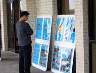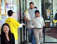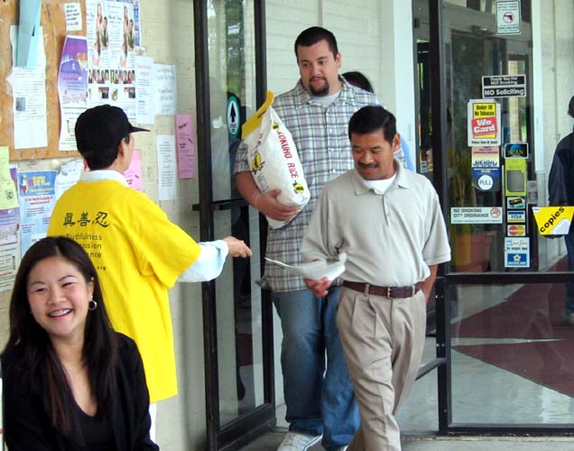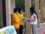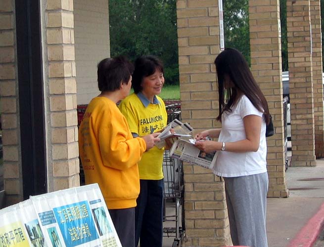 象每一次的洪法活动一样,总是能碰到有缘人。一位中年妇女接过学员的材料后,与学员交谈了起来,变得越来越感兴趣,最后要去炼功点学功。学员们发现大部分的人都知道法轮功和修炼法轮功是对身体好的。一位老年学员从活动的开始就在发真象材料一直到结束,在旁边买东西的人还给她椅子让她休息休息,希望她明天还来。