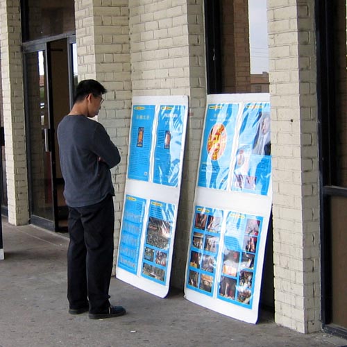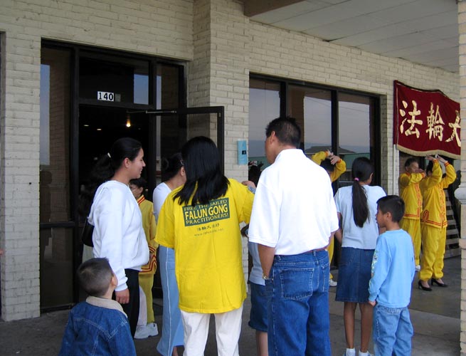 2004年5月13日这一天的下午,部分法轮功学员带着上午刚刚印刷出的介绍法轮功真象的报纸《Falun Dafa Reader》来到达拉斯的市中心,在过往的人群川流不息的地铁车站附近洪法。一位女学员带着两个孩子,小的只有一岁多,乘地铁远道而来参加了活动。另外一位学员也特意请了假来参加在这个特殊的日子里的洪法,她说:“我想在这天,用洪法的方式让更多的人了解大法,让有缘人接到我们的大法传单。”