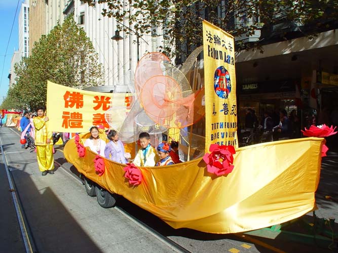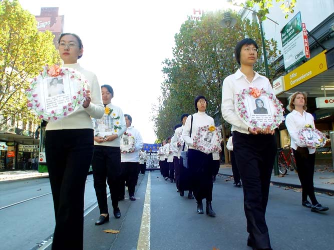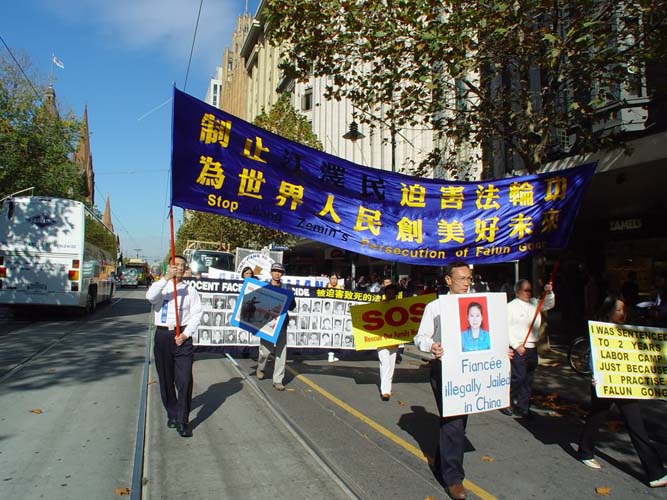 中午12时,浩浩荡荡的游行队伍从联邦广场出发。游行队伍由5个方阵组成,分别是:世界需要“真、善、忍”、大法洪传、酷刑展示、全球审江、佛光普照。