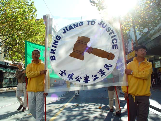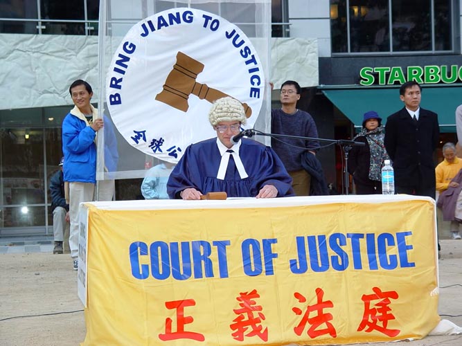 在模拟法庭上,法官向参加庭审的人们宣布了江所犯下的如反人类、种族灭绝等10项滔天罪行。于去年年底被成功营救至澳洲的,曾被非法关押于上海青松女子劳教所的李迎讲诉了自己在狱中受到的迫害。全家六人,在同一夜里被不具任何理由,不经任何手续被分别带至公安局,并被强行关进看守所,进而被劳教的的孙先生讲诉了一家的遭遇。而在那一夜,仅他所在的市区便有27位法轮功信仰者同时被抓。曾在2001年前往天安门广场成功请愿的西人学员凯特讲诉了她仅为说了一句“法轮大法好”便被非法关押的经过。一件件事实、一场场亲身经历,更具体直接地揭露了这一灭绝人性的罪行和其背后的狡诈阴谋及险恶欺骗。