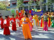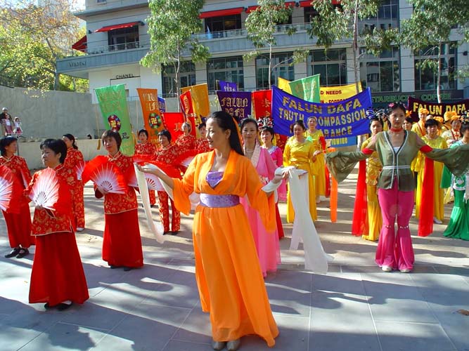当经过一夜旅途颠簸前来参加游行的悉尼法轮功腰鼓队整齐的亮相于第一方阵时,马上吸引了来自四面八方的行人。他们和彩绸舞一同为市民们带去了中国传统文化精髓,也拉开了此次游行的帷幕。