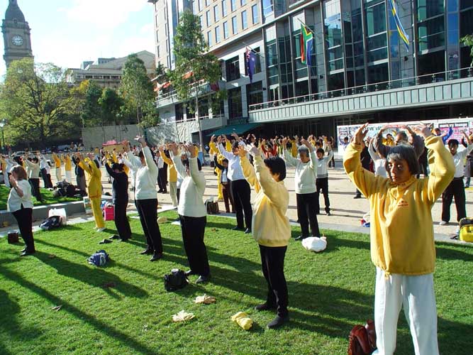 在市政广场的另一端,学员们始终如一的五套功法展示,以舒缓的动作、祥和的神态引起了人们的极大兴趣,也吸引了更多的有缘人。一对从西澳珀斯来旅游的老夫妇在学员们整齐而壮观的功法表演面前站了足足有一个半小时,他们从头到尾观看了第一至第五套功法,生怕漏掉一个动作。得知他们下周将游玩至悉尼,一位悉尼学员在为其介绍每一套功法及动作之后,与他们相约,悉尼再会。
