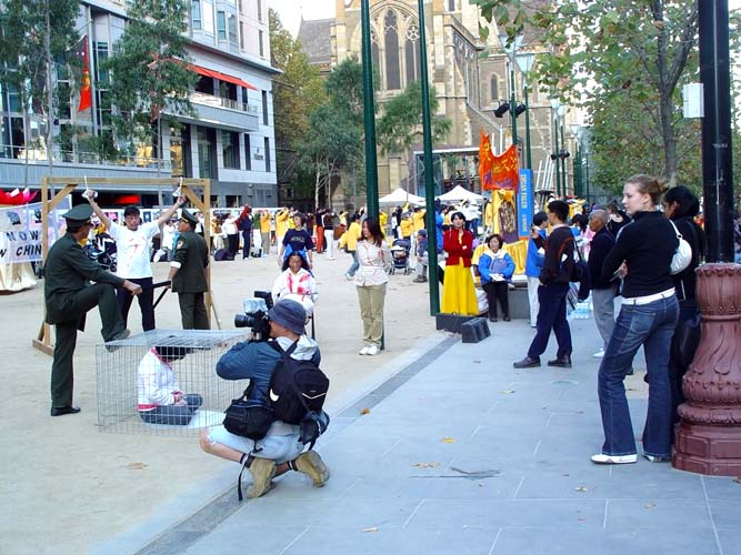 与此同时,在庭审席的左侧的拟真监狱里,演示着中国国内迫害法轮功的真实场景。三名法轮功学员正在被恶警施予酷刑:吊挂、囚笼和坐老虎凳。同时,恶警还用电棍和皮鞭不断地击打他们,试图威逼学员们做出不修炼、放弃信仰法轮大法的保证。有的旁观路人被感动的流下眼泪。演示结束后,一位老者特地找到扮演被迫害的女学员,当他得知这一切都是真的时,他拍拍她的肩膀说:“孩子,一切都会好起来的。”