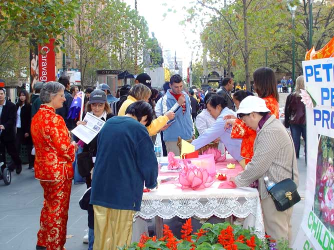 游行过后,学员们在城市广场,進行了進一步讲清真相和洪法活动。模拟审江法庭、12年法轮功风雨历程图片展、全球诉江展板、“和平花瓣”叠纸莲和大型功法展示五个板块同时進行,大法的美好殊胜与江氏的残酷镇压形成了鲜明的善恶对比。全世界范围内对于真善忍的认可与对于正义的追求揭示了自古以来,人类所信奉的道义标准:邪不压正。在令人震撼的图片和事实面前,包括大陆游客、中国留学生在内的更多世人认识到了江氏集团对法轮功迫害的本质。