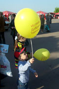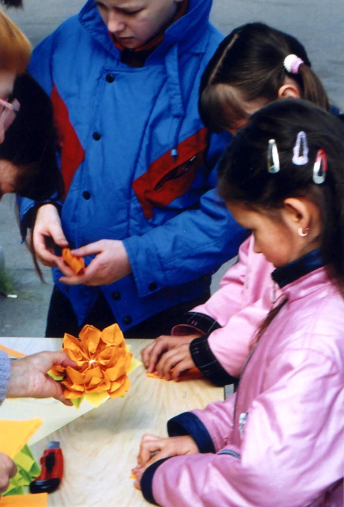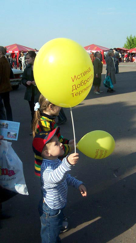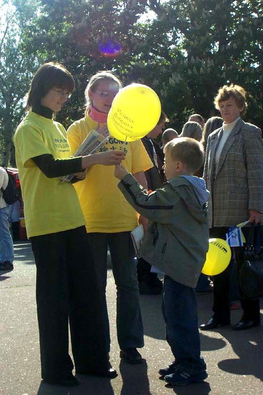 天气虽然寒冷,但这天正好也是基辅市的欧洲日,所以游人还是非常的多,准备的真象资料很快就发出去了。法轮功学员们还给孩子们准备了特殊的礼物,就是给他们赠送了上面写有“法轮大法好 ”等字样的气球。同时还有学员教人们怎么用纸折莲花。学员们的微笑和正念让人们感受到了法轮大法的美好。