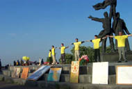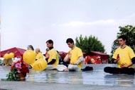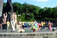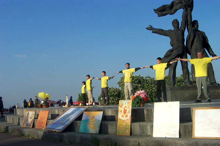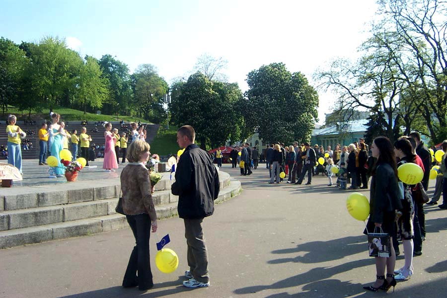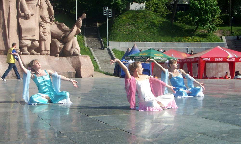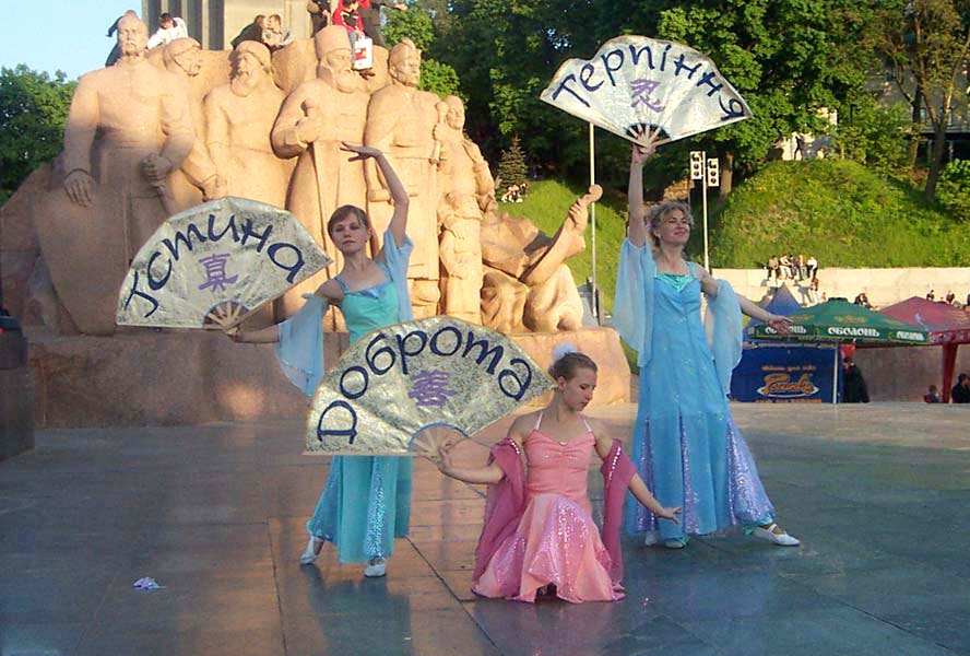 【明慧网2004年5月18日】2004年5月15日下午3点到晚8点,为庆祝“世界法轮大法日”,乌克兰法轮功学员在基辅市中心的人民友谊广场举办了洪法活动。除了向人们展示功法外,法轮功学员们还展示了自己的艺术作品,同时献上中国传统式的舞蹈。