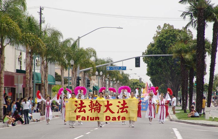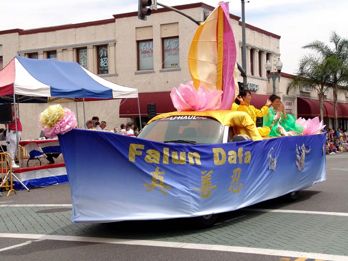 法轮功队伍被称为阵容最庞大的队伍,由仙女舞蹈队、腰鼓队和花车组成。碧天丽日之下,黄底红字的「法轮大法」、「法轮大法好」及蓝底金字的中英文「真善忍」大横幅分外醒目。翩翩起舞的仙女、威武雄壮的腰鼓,以及花车上的功法演示,把真善忍的美好带给大众。沿途的观众报以热烈的掌声、欢呼声。