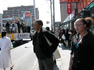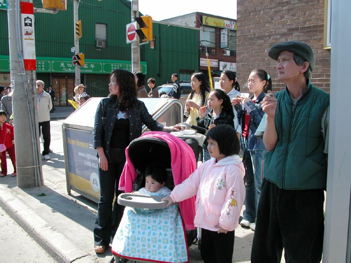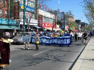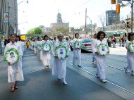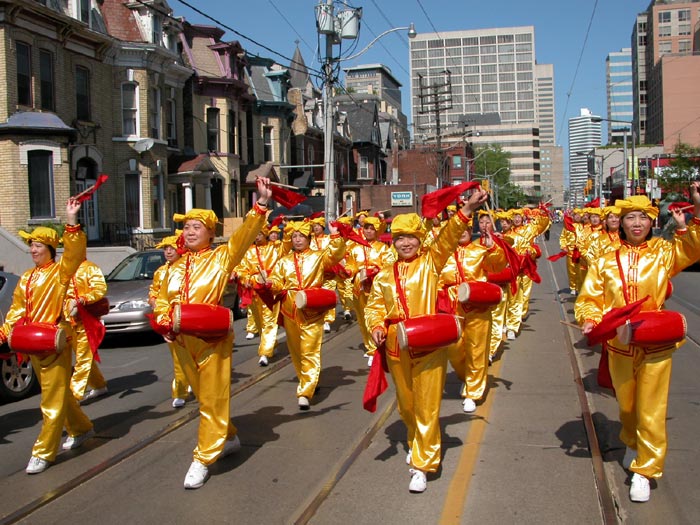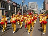 在“法轮大法”,“真善忍”的横幅和大法轮图案后面的是游行队伍的第一个方阵。小有名气的多伦多法轮功腰鼓队以一曲“神雷”开道,真是“神雷炸阴霾散”(《天又清》)。据腰鼓队的领队王女士介绍说,多伦多法轮功腰鼓队已经多次被邀请参加了包括全球华人新年晚会,DearArts艺术团表演等多次演出和社区活动(如游行等),并即将赶赴芝加哥参加下个周末在那里举行的大游行,为五月底的诉江案听证会助阵。