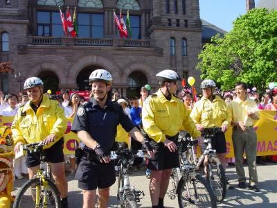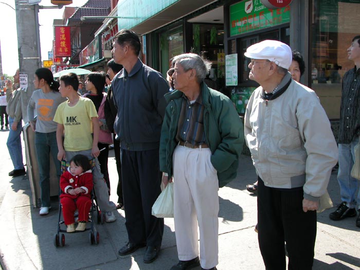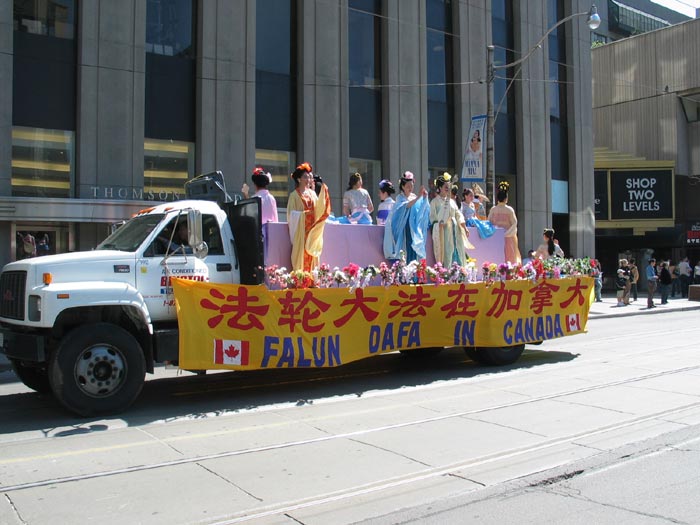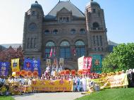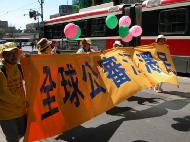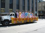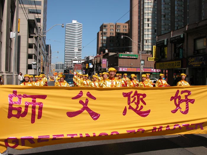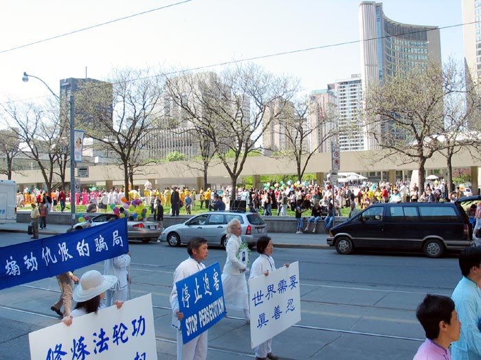 5月16日已是多伦多的阳春季节,艳阳高照,晴空万里,天气和暖。游行从多伦多市政府前的菲利浦广场出发,一路吸引了沿途许多民众驻足观看,游行队伍穿过多伦多最热闹繁华的市中心、唐人街,最后行進到省议会门前。整个游行队伍分为五大方阵:“大法洪传人心归正”,“违背承诺突然镇压”,“不畏强暴和平请愿”,“反迫害审判江泽民”,“佛光普照 礼义圆明”,大游行展现的是法轮大法自1992年由李洪志先生在中国大陆公开传出以来,历经沧桑而又光明辉煌的洪传历程;同时腰鼓队、舞狮、舞蹈等五彩缤纷的节目表演贯穿其中。游行队伍到安省政府前结束,最后学员们合唱“法轮大法好”并合影留念。