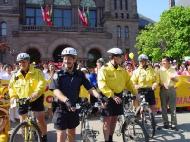 在学员匆匆跑过十字路口以免堵塞交通的时候,警察们都忍不住合十表示感谢,一路为游行开道的警察也不时与学员愉快招手,并在游行结束后与学员合影留念。最后,法轮功学员代表赠送给这些警察每人一件法轮大法T-恤衫和一张法轮功学员自己创作演唱的音乐光盘,警察先生们十分感谢,表示去年就希望能拥有一件法轮大法T-恤了,今年终于如愿以偿。