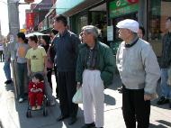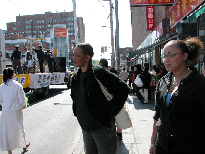 一警察表示这次游行很壮观,参与的人数众多。他们都奇怪的问一个学员张先生说,你们当时申请游行许可的时候是说五百多人哪,怎么现在来了一千多人参加呢。下次要告我们一个准确数字,这样我们好给你们更方便的服务。还有一位曾经与法轮功学员一起参与了全球华人联合晚会的华人艺术家和她的家人,在与法轮功学员同台演出和相处的过程中,了解了法轮功真象,同时被法轮功学员善良、宽容的境界和和平呼吁所感动,今天也特意赶来参加游行,与法轮功学员一道走完了全程。并且游行结束后,她还特意准备了冰冻的豆浆送给参加游行的学员解渴,令学员非常感动。游行队伍中有50多名了解了真象后的法轮功之友也闻讯特意赶来参加游行,在五个方阵之后组成了“第六方阵”一同参加游行表示支持。