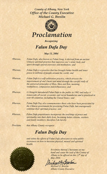 纽约州奥尔巴尼(Albany)郡是纽约州府奥尔巴尼所在地,近日郡长迈克-布莱斯林(Michael G. Breslin)发布了此褒奖令。