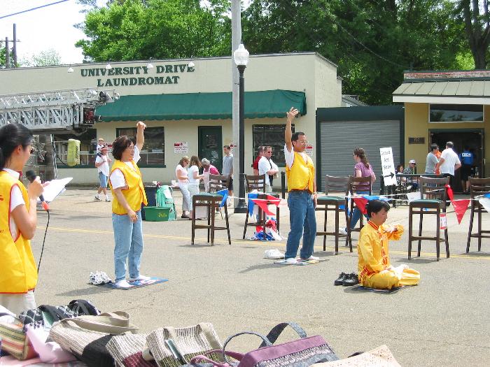 【明慧网2004年5月2日】诗城(Starkville)是个宁静美丽的美国南方小镇,密西西比州立大学即位于此。每年四月中都会有一个艺术节日,当地的法轮功学员们在接着四月三日在学校的国际节中的讲真象活动后,于四月二十四日的艺术节也设立了一个摊位,展出看板及发传单。为了不落下一个有缘人,学员背着真象资料走遍艺术节的每个角落,将真相材料送到每个摊位上,同时向遇到的游人介绍大法及讲真象。