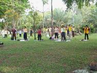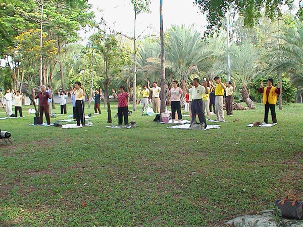 16日清晨,泰国法轮功学员在曼谷是乐园集体炼功之后,在公园里挂起了“热烈庆祝法轮大法洪传十二周年”、“世界需要真善忍”、“法轮大法是正法”的大型标语,并在展开的“敬祝师父生日快乐”的横幅前,摆上了鲜花,气球和手工自做的彩色莲花,以祝贺声与歌声,敬祝师父53华诞和欢庆法轮大法日,公园里洋溢着一片欢乐的气氛。中午,一些学员还去了中国游客较多的旅游点,向人们洪法、发资料。